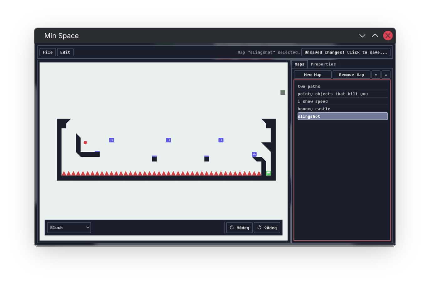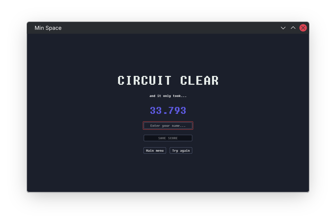That's everything! This release is just a huge polish of Min Space. I know I have no right to be doing this since this game was originally made for a hackathon, but! It's playable now! Hopefully you can actually have fun playing the main circuit or even make maps you can export and then share with other people!
